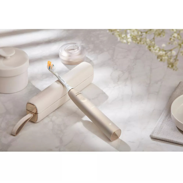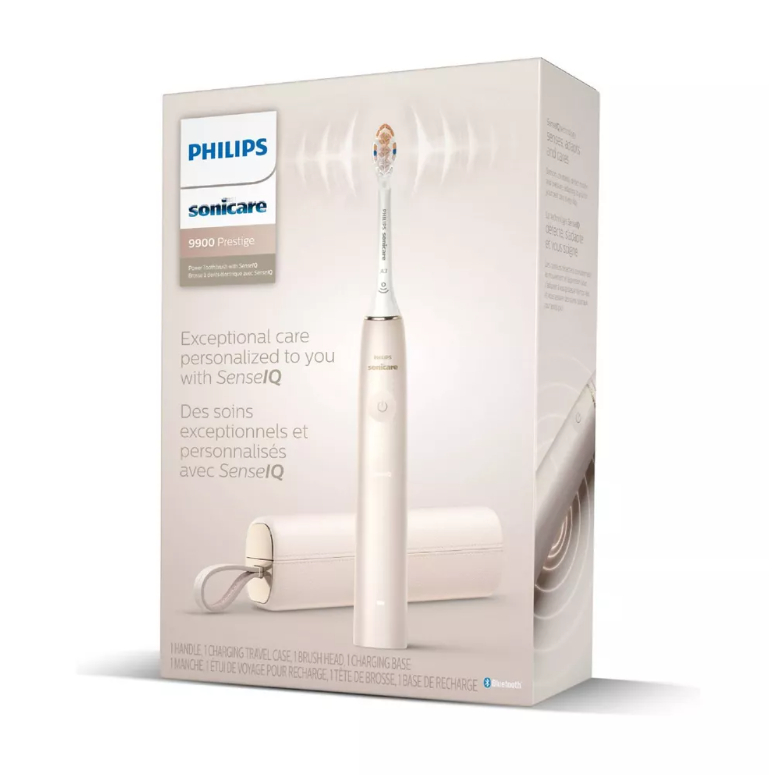 * Loại sản phẩm: Bàn chải điện Philips Sonicare 9900 Prestige with SenseIQ + Xuất xứ: USA* + Thương hiệu: Philips * Quy cách: Hộp sản phẩm gồm 01 bàn chải đánh răng điện Philips Sonicare 9900 Prestige with SenseIQ, 01 đầu bàn chải A3 Premium All-in-One, 01 dây sạc USB cổng C, 01 đế sạc từ, 01 hộp du lịch da mềm cao cấp có tích hợp sạc cổng USB, tài liệu hướng dẫn. + Độ tuổi sử dụng: Dành cho trẻ từ 15 tuổi trở lên và người lớn + Chế độ bảo hành: 6 tháng sau khi giao (chỉ bảo hành những lổi hỏng hóc do nhà sản xuất,không chịu trách nhiệm với hỏng hóc do người dùng gây nên) * Tính năng sản phẩm + Chăm sóc răng miệng với công nghệ sóng âm Sonic + Có 5 chế độ đánh răng: - Clean: Làm sạch tiêu chuẩn - Deep Clean: Làm sạch chuyên sâu - White+: Làm trắng răng - Gum Heaith: Chăm sóc răng nướu - Sensitive: Chải răng nhạy cảm + Đèn led trên thân máy sẽ hiển thị chế độ chải đã lựa chọn - 3 mức độ làm sạch: Mạnh - Trung bình - Nhẹ + Rung sóng âm: 62000 lần/ phút + Bộ hẹn giờ báo khi sử dụng trong 2 phút đánh răng + Tay cầm chống nước, chống trơn trượt +Tích hợp pin Li-on có thể sử dụng lên tới 14 ngày (mỗi ngày 1 lần và mỗi lần 2 phút) +Điện thế : 110-220v * Đặc điểm nổi bật của Bàn chải điện Philips Sonicare 9900 Prestige with SenseIQ cho người lớn + Bàn chải điện Philips chăm sóc nhẹ nhàng và hiệu quả với công nghệ sóng âm Sonic độc quyền; + Làm sạch các mảng bám trên răng gấp 20 lần so với bàn chải thường; + Công nghệ SenseIQ tiên tiến cảm nhận chuyển động làm sạch và phạm vi bao phủ lên đến 100 lần/ giây; + Đầu chải A3 Premium All-in-One với thiết kế tam giác có tác dụng loại bỏ tới 100% vết ố vàng trong thời gian ngắn; + Hệ thống sạc kép gồm đế sạc từ và sạc USB; hộp da tích hợp dây sạc tiện lợi khi đem theo người; + Chế độ cảm biến lực nhấn Pressure Sensor vừa rung và nháy đèn ở dưới đế bàn chải giúp người dùng duy trì lực đánh răng vừa phải tránh gây tổn thương vùng nướu; + Kết nối với smartphone bằng Bluetooth sử dụng app Sonicare cá nhân hóa việc lưu trữ thông tin để người dùng tiện theo dõi và so sánh từng giai đoạn chăm sóc răng miệng; + Bộ báo giờ Quadpacer và hẹn giờ tắt Smartimer sau mỗi 30 giây chải răng kêu bíp nhắc nhở chải răng qua khu vực khác, tay bàn chải tự động tắt sau 2 phút sử dụng; + Công nghệ BrushSync giúp theo dõi thời gian sử dụng đầu bàn chải và thời gian bạn chải răng. Đèn trên thân bàn chải báo hiệu thời gian thay đầu bàn chải điện bằng tiếng "bíp"; + Chế độ báo pin thông minh bằng đèn LED nhấp nháy khi pin yếu nhắc nhở người dùng sạc điện; + Hộp sạc du lịch với thiết kế chất liệu da mềm mại, thân thiện với môi trường; + Bàn chải đánh răng điện Philips có kiểu dáng thiết kế tạo thế cầm chắc chắn, bọc lót khi cầm không bị rơi. * Đối với tùy lô sẽ có nguồn gốc tại các nước khác nhau như Uk, Korea, Australia...Lưu ý xuất sứ này để chỉ khu vực nhập sản phẩm, không phản ánh trụ sở nhà máy sản xuất.
