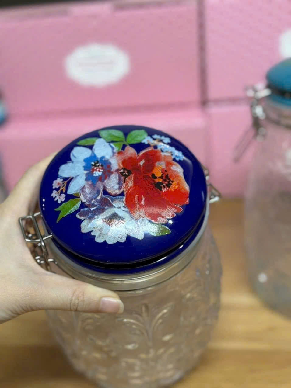 Được làm từ thủy tinh trong suốt, những chiếc hũ này không chỉ mang tính thẩm mỹ mà còn giúp bạn dễ dàng nhìn thấy bên trong. Nắp gốm với hoa văn đẹp mắt, mỗi chiếc thể hiện thiết kế hoa đặc trưng của Ree với những gam màu rực rỡ như đỏ, xanh lam và xanh nhạt.