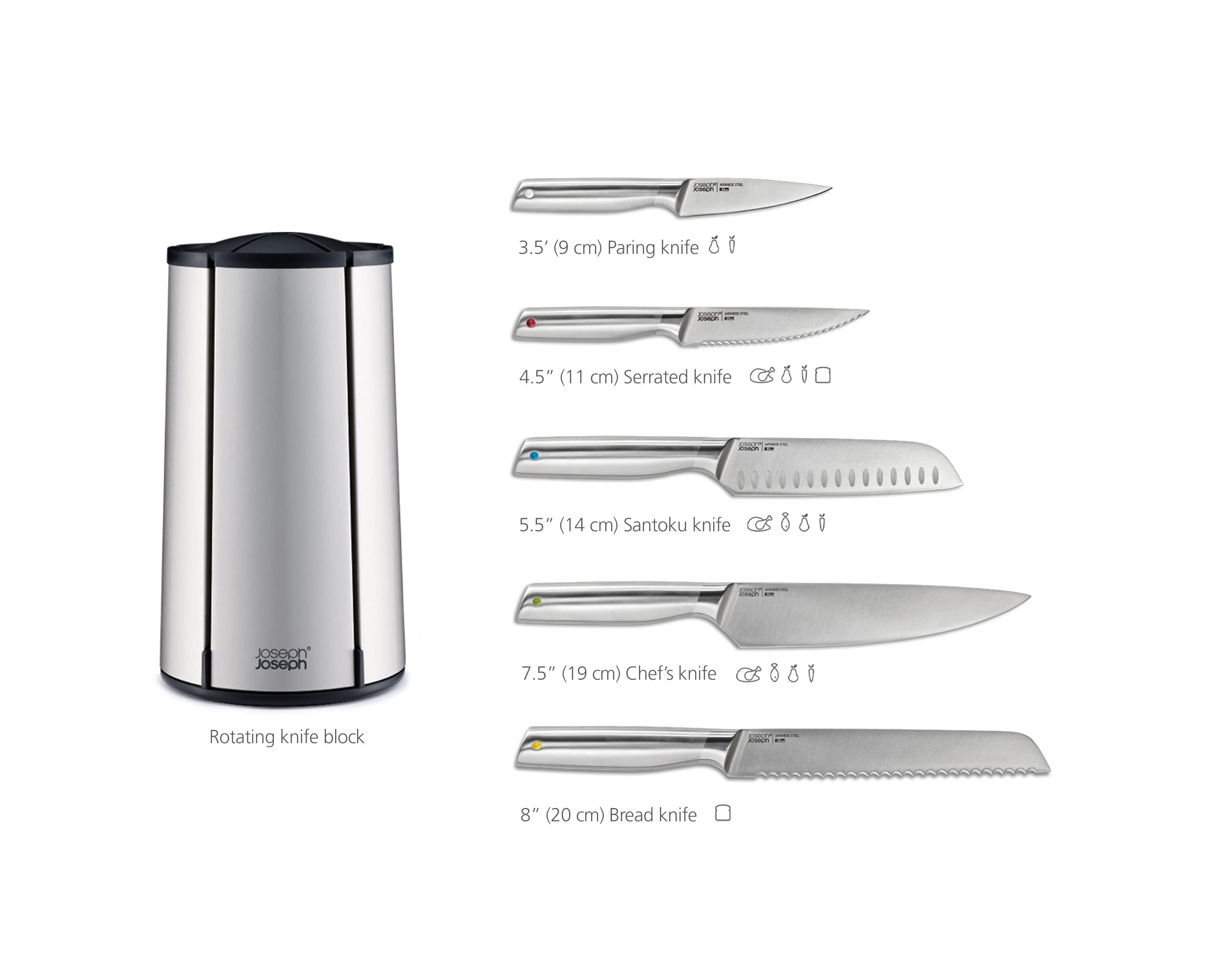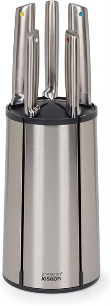 Bộ dao xoay chất lượng cao này bao gồm năm con dao nhà bếp thiết yếu cùng với một giá đỡ bằng thép không gỉ có thể xoay được với các khe cắm dao từ tính.