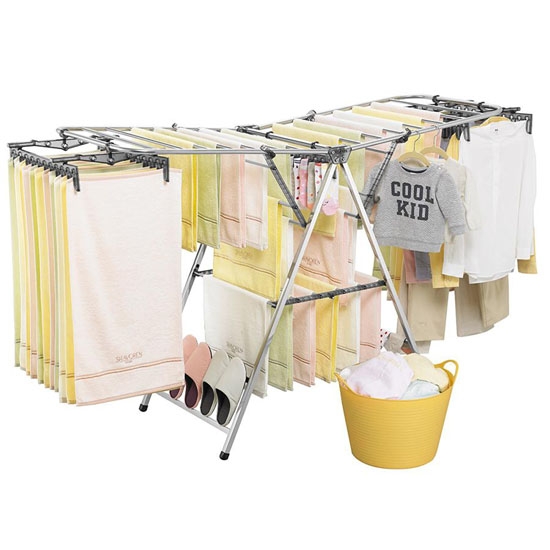 Sản phẩm tích hợp đầy đủ cả chức năng phơi và giá phơi đỡ đồ cố định. Khi giá phơi mở ra, giá đỡ được hỗ trợ tự động trên giá phơi. Thanh phơi liên kết chắc chắn, cố định. Giàn phơi giúp bạn phơi quần áo được nhiều hơn bằng cách sử dụng kẹp quần áo (Kẹp quần áo lên trên, kéo đồ phơi xuống bên dưới).
