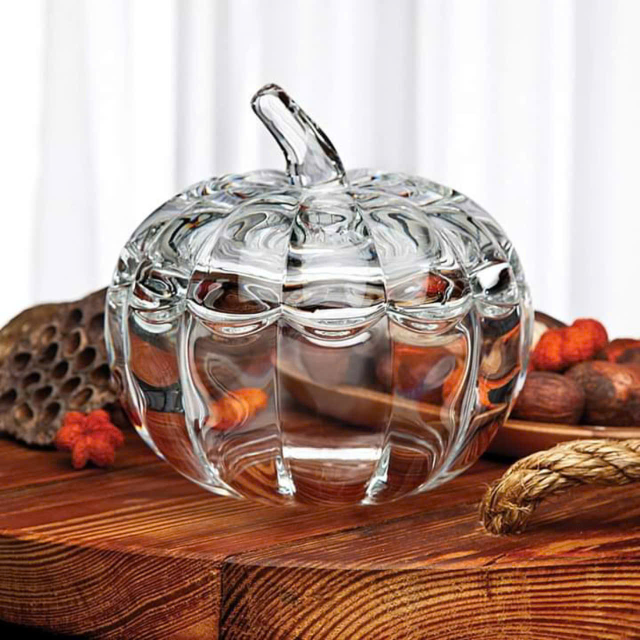 Hũ phale trong veo bóng đẹp hình bí đỏ đẹp lắm. Hũ bày chút hạt sồi khô, thông khô, để xíu kẹo, hay các loại nuts nguyên vỏ cũng xinh lắm í.