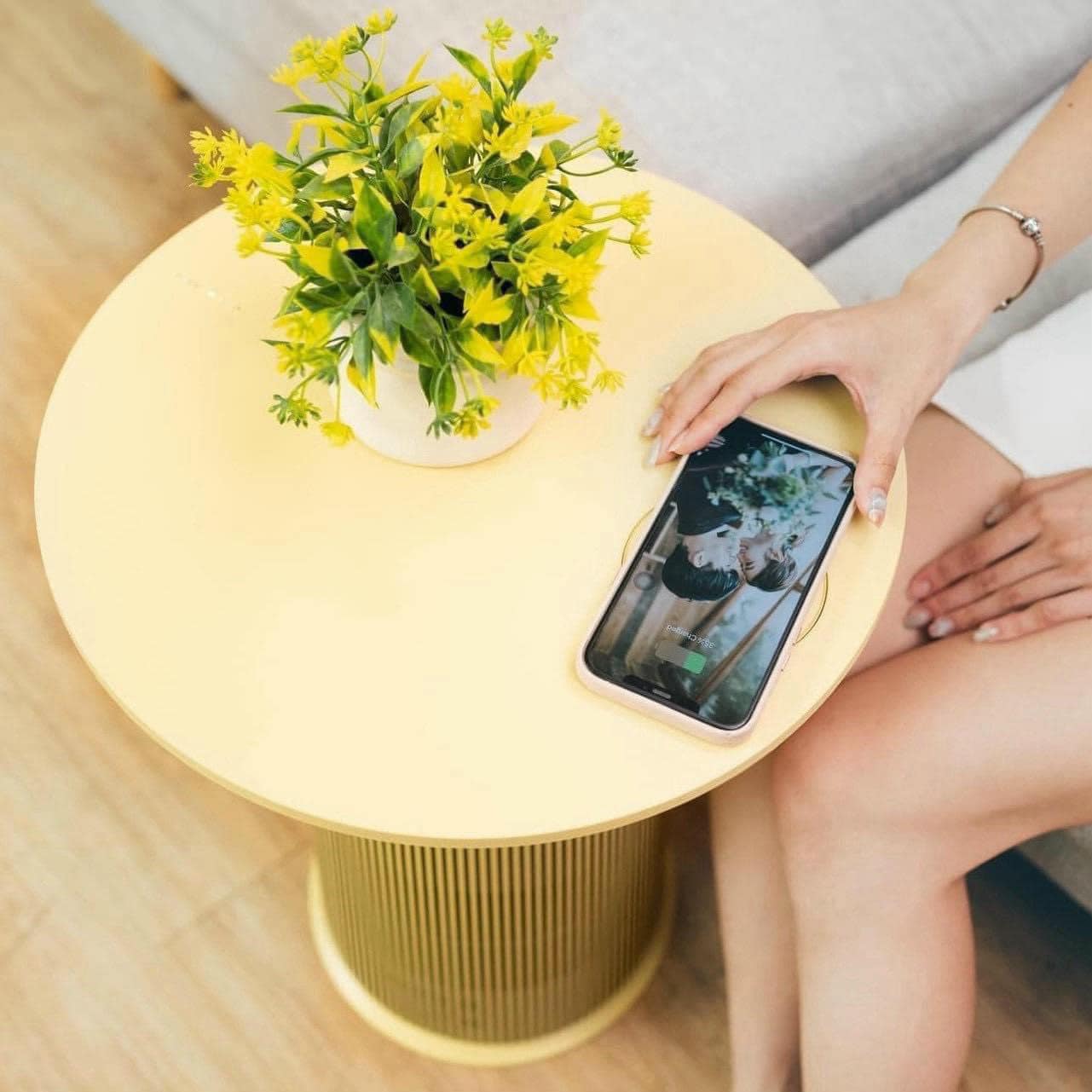 - Phần trên được thiết kế là một mặt bàn kiêm chức năng sạc điện thoại, tai nghe không dây.