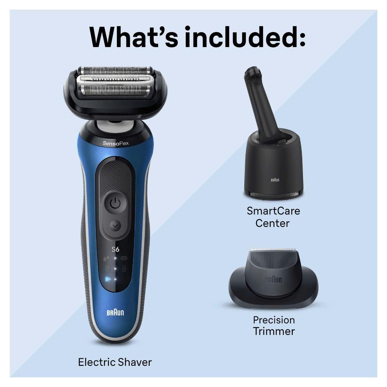 Bao gồm: Phần đính kèm Precision Trimmer để cắt tỉa ria mép và tóc mai, đế sạc đứng, bao đựng, thân máy, sạc