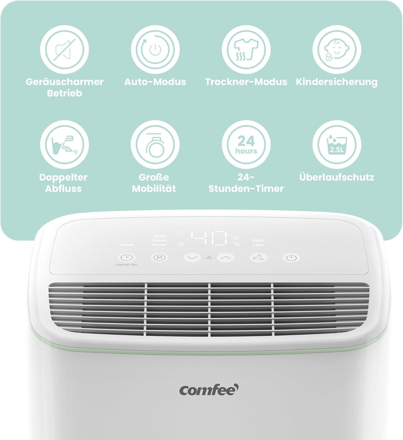 -Khả năng hút ẩm hiệu quả: công suất hút ẩm tối đa 10 lít/24 giờ. Thích hợp cho phòng có diện tích lên đến khoảng 40 m³ (16 m²). Đặc biệt hữu ích trong tầng hầm, nhà bếp và các phòng thông gió kém.