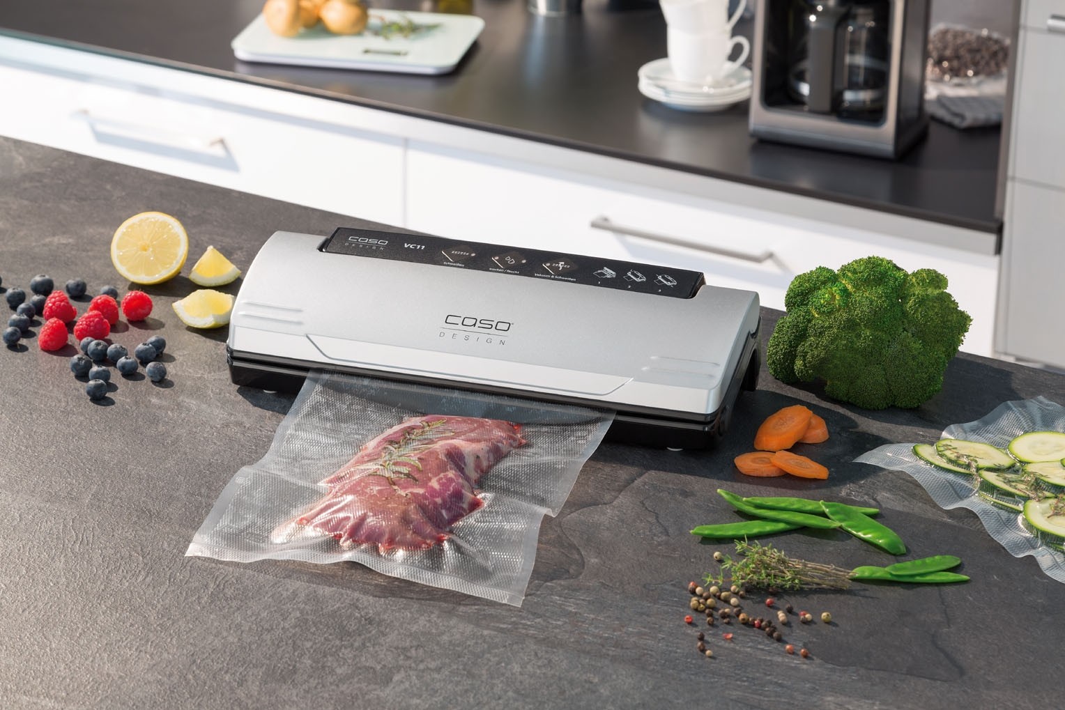 - Với máy hút chân không Caso VC11, thực phẩm luôn tự nhiên tươi ngon, đảm bảo giữ nguyên được các vitamin trong thực phẩm mà không cần dùng chất bảo quản. có thể dùng cho bất cứ loại thực phẩm, đồ sống, đồ chín, hoa quả, rau, đồ khô....... Giúp tiết kiệm diện tích lưu trữ.