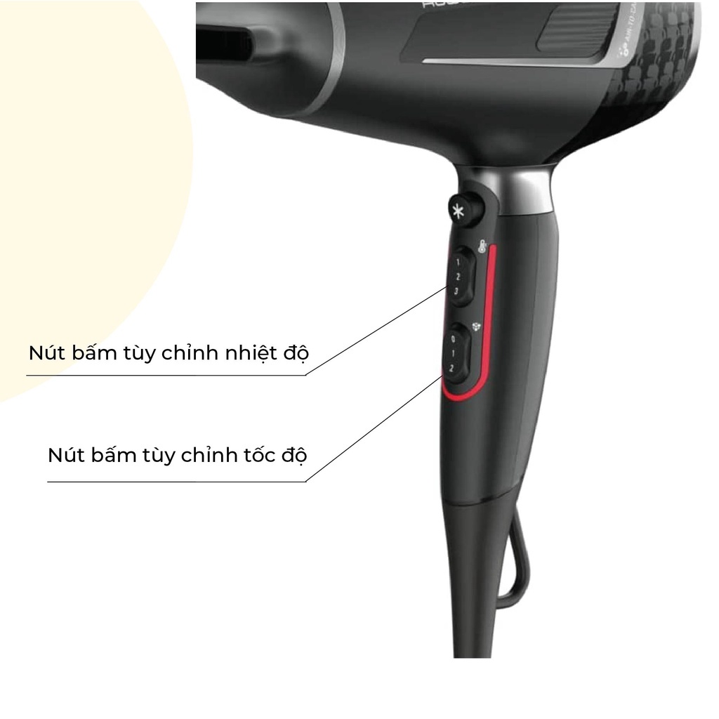 Máy sấy tóc cao cấp Rowenta CV888LF0 - Model mới nhất 2022 Đặc điểm nổi bật của Máy sấy tóc cao cấp Rowenta CV888LF0: - Thiết kế nhỏ gọn, màu đen huyền bí tạo cảm giác tươi trẻ, sang trọng và hiện đại. Thiết kế tay cầm chắc chắn, có thể gập lại nhỏ gọn tiện dụng để mang đi xa. - Công suất 2200W với tốc độ gió 130km/h, 3 tốc độ sấy và 2 chế độ sấy mát, dễ tùy chỉnh bằng nút gạt, giúp sấy tóc nhanh khô; tiết kiệm thời gian, điện năng và công suất. Bạn có thể tùy chỉnh chế độ sấy khô hoặc sấy mát bảo vệ tóc bằng cách trượt/gạt nhẹ công tắc trên tay cầm, vô cùng tiện dụng và dễ dàng. - Có khả năng hút khí hiệu quả, giảm ồn. Chế độ tự ngắt quá nhiệt khi quá tải, tăng tuổi thọ máy sấy. - Cơ chế sấy bảo vệ tóc (Thermoprotect) giúp duy trì nhiệt độ chăm sóc ổn định ở mức 57 – 58 độ C (là nhiệt độ hoàn hảo để sấy và tạo kiểu tóc mà không lo ngại làm hư tổn tóc. Tính năng này cho phép bạn sấy tóc khô nhanh mà không bị khô quá mức, giữ được độ ẩm tự nhiên của tóc, giúp mái tóc bóng mượt khỏe mạnh. - Tính năng sấy ion cao cấp Rowenta tỏa ra luồng khí ion âm thẩm thấu sâu vào tóc giúp giữ ẩm. Ion âm còn giúp tóc chắc khỏe, bóng mượt và ngăn ngừa xơ rối, gãy ngọn. Thường được kết hợp cùng chế độ sấy Turbo cho mái tóc khỏe đẹp. - Vì sử dụng nhiệt độ nên các máy sấy tóc cao cấp Rowenta CV88LF0 đều được trang bị cơ chế tự ngắt khi nhiệt độ cao quá mức cho phép của nhà sản xuất nhằm đảm bảo độ bền cho máy và an toàn cho người sử dụng. Thông số chi tiết của Máy sấy tóc cao cấp Rowenta CV888LF0: - Thương hiệu: Rowenta. - Nhập khẩu chính hãng 100% từ Đức. - Kích thước: 92,5 mm x 182 mm x 298 mm. - Công suất: 2200W. - Tốc độ gió: 130km/h. - Độ dài dây điện: 1,8m. - Chế độ gió lạnh; 3 mức cài đặt nhiệt; 2 mức tốc độ gió. - Đầu vòi tạo kiểu 9mm. - Công nghê Air – to – Care tăng cường lon âm và lon dương khôi phục nhanh cho mái tóc. - Lớp phủ Keratin – Glow tạo độ bóng sáng, mềm mượt. SHOP bepduc_99 CAM KẾT - Đổi trả sản phẩm trong 3 ngày nếu lỗi do nhà sản xuất - Máy bảo hành 12 tháng
