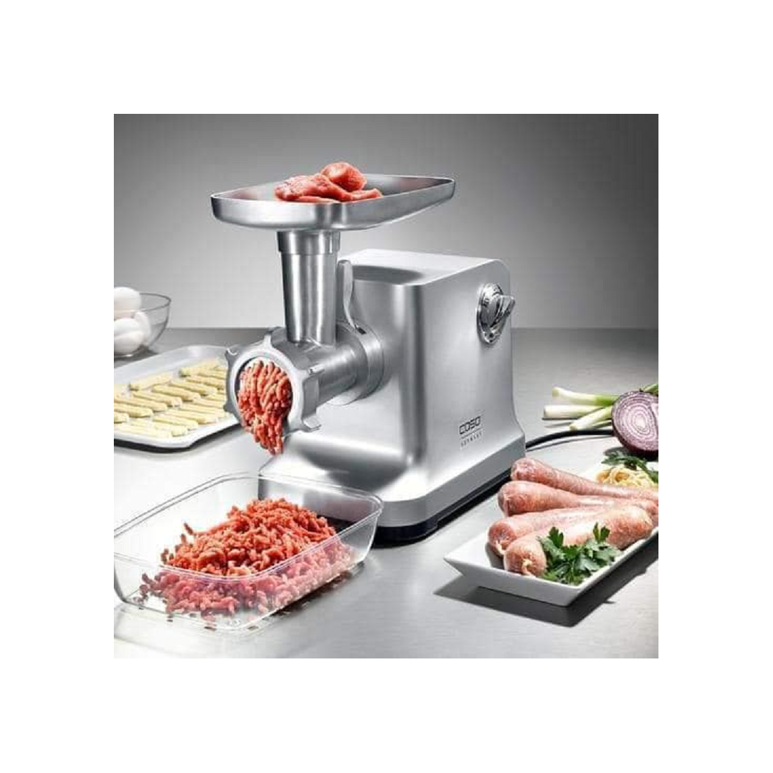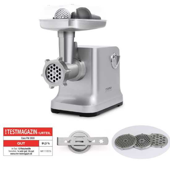 Với máy xay thịt điện Caso FW2000 trong vỏ nhôm đúc chắc chắn, bạn có thể sản xuất ví dụ như xúc xích, thịt băm, bánh tartare hoặc bánh quy.