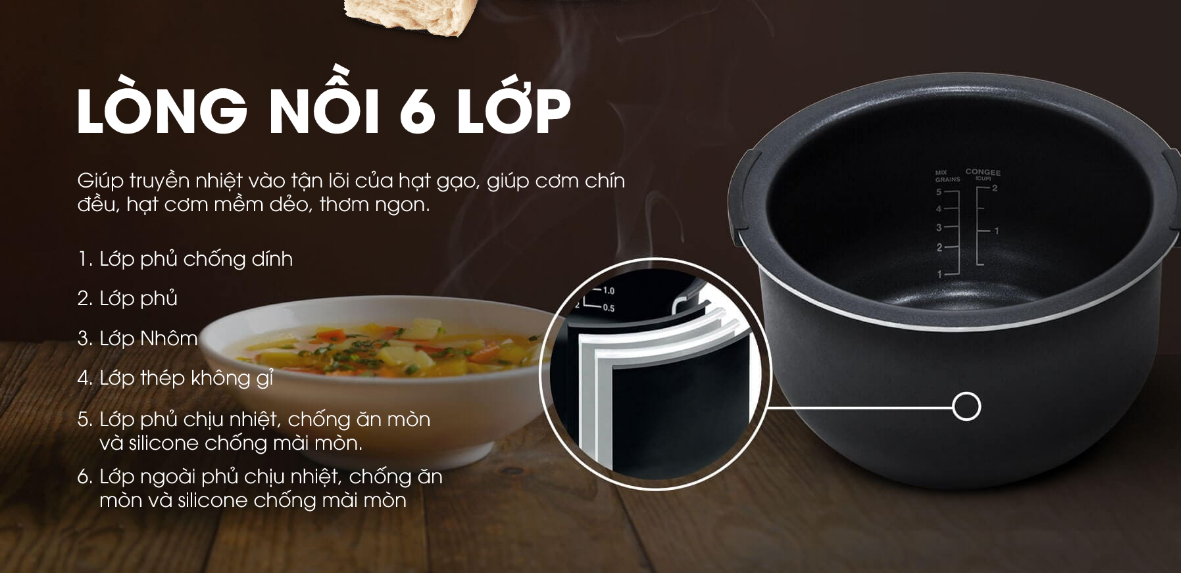 Lòng nồi có 6 lớp giúp truyền nhiệt vào tận lõi của hạt gạo, giúp cơm chín đều, hạt cơm mềm dẻo và thơm ngon. Gồm có lớp phủ chống dính, lớp phủ, lớp nhôm, lớp thép không gỉ, lớp phủ chịu nhiệt, chống ăn mòn và silicone chống mài mòn và lớp ngoài phủ chịu nhiệt, chống ăn mòn và silicone chống mài mòn.