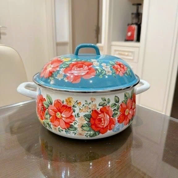 Lấy cảm hứng từ phong cách cổ điển với thiết kế sắc hoa rực rỡ trên bàn ăn tạo cảm giác đồng quê chiếc nồi The Pioneer Woman 3.7L nắp xanh chắc chắn sẽ mang đến cho bạn và gia đình bữa ăn ngon miệng và lạ mắt.